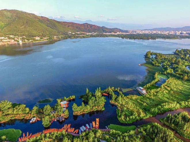 2023年8月的一个清晨,摄影师杨建给我发了一张邛海的航拍照片。在这张照片,泸山屹立在画面的最上方,画面中部和左侧是蔚蓝色的邛海主湖,画面的最下方,湖汊纵横,湿地如翡。右侧,红白相间的建筑与湿地相接,西昌城款款依偎在旁边。