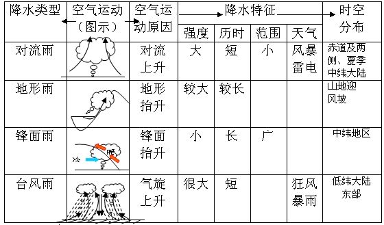 4)天气系统:低压气旋、锋面空气上升降温,水汽凝结致雨;高压反气旋空气下沉,干燥少雨